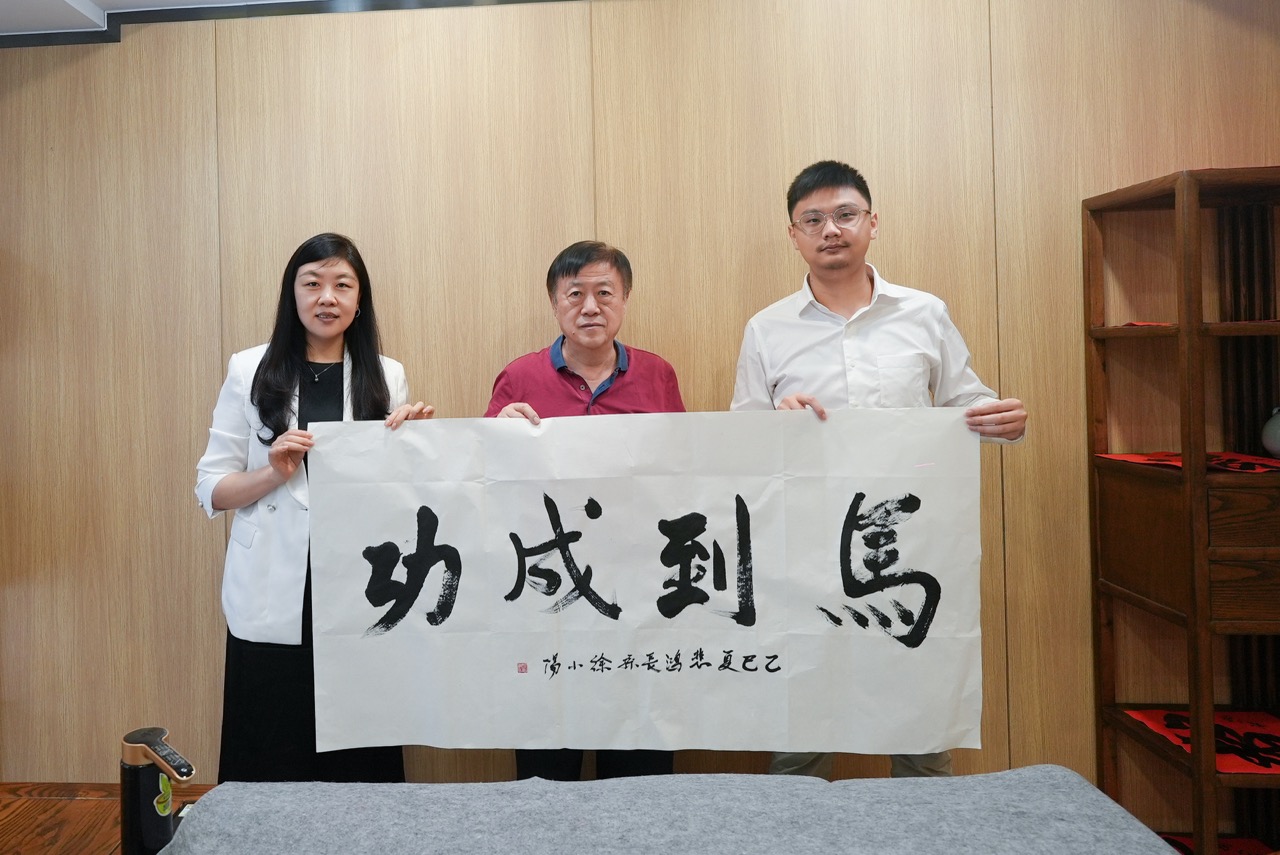 参观尾声,徐小阳先生即兴挥毫,为我校校训题写墨宝,其笔力遒劲的书法作品饱含对学校发展的殷切祝福。随后,嘉宾一行在嘉庚像前合影留念,并围绕艺术教育创新、文化传承等话题展开交流。