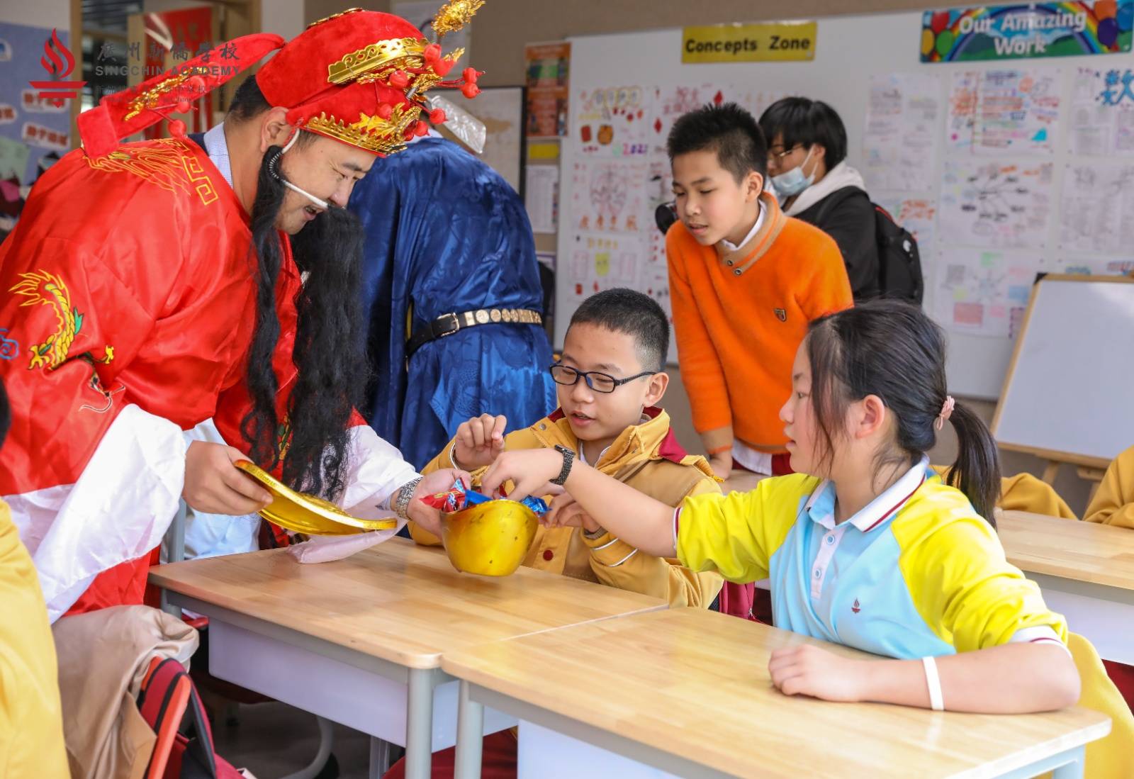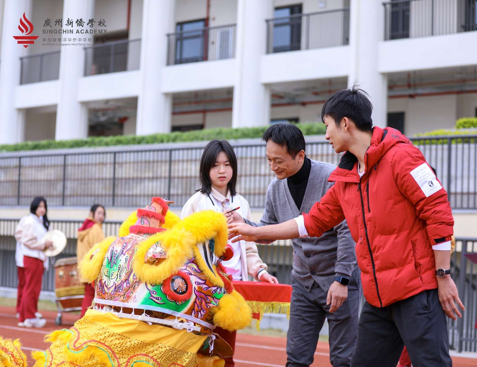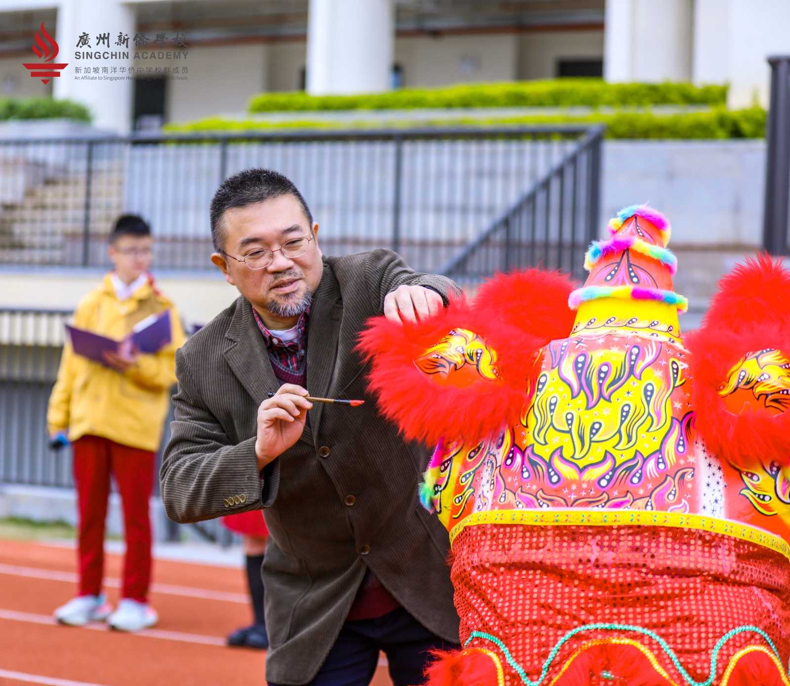 在完成醒狮点睛后,随着阵阵欢快的锣鼓声,新侨醒狮队的同学们偕同文曲星、财神爷开始了拜年之旅,为同学们带去心意红包!