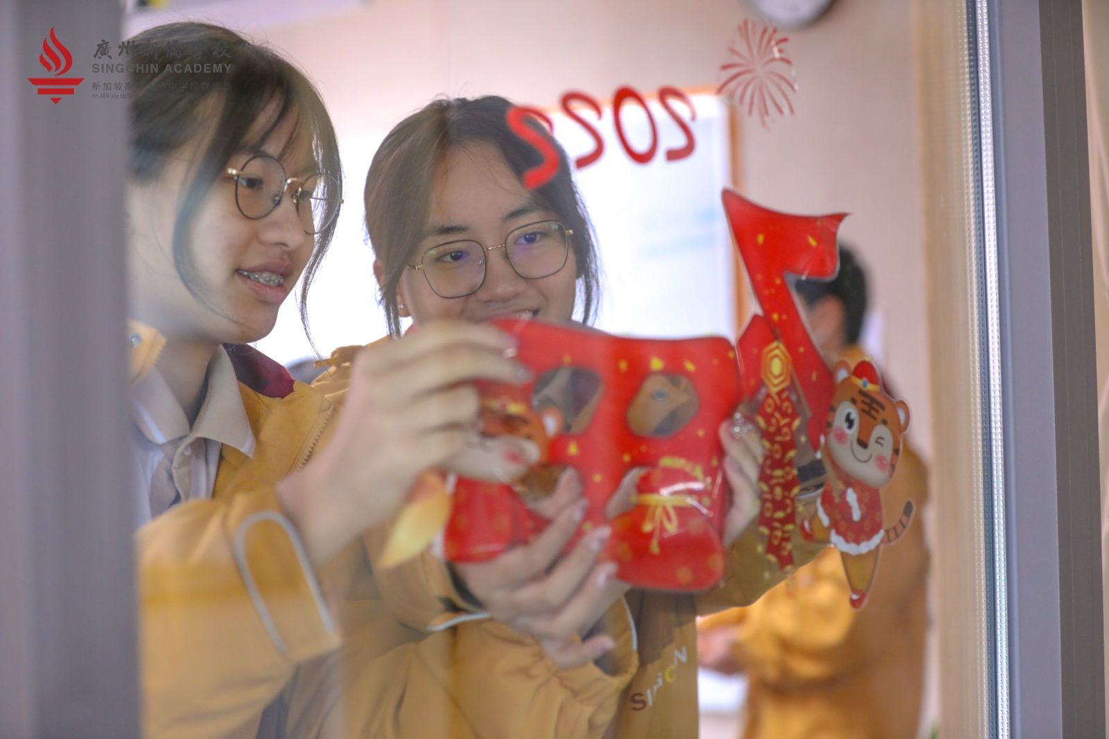 踏入学校,同学们惊喜地发现,校园焕然一新,窗明几净,角角落落年味十足:对联、窗花、虎纹、年橘....而回到班级,与许久未见的同桌和朋友兴奋地分享假期趣事,共同来为课室进行节日装饰,这种快乐更是难以言喻。